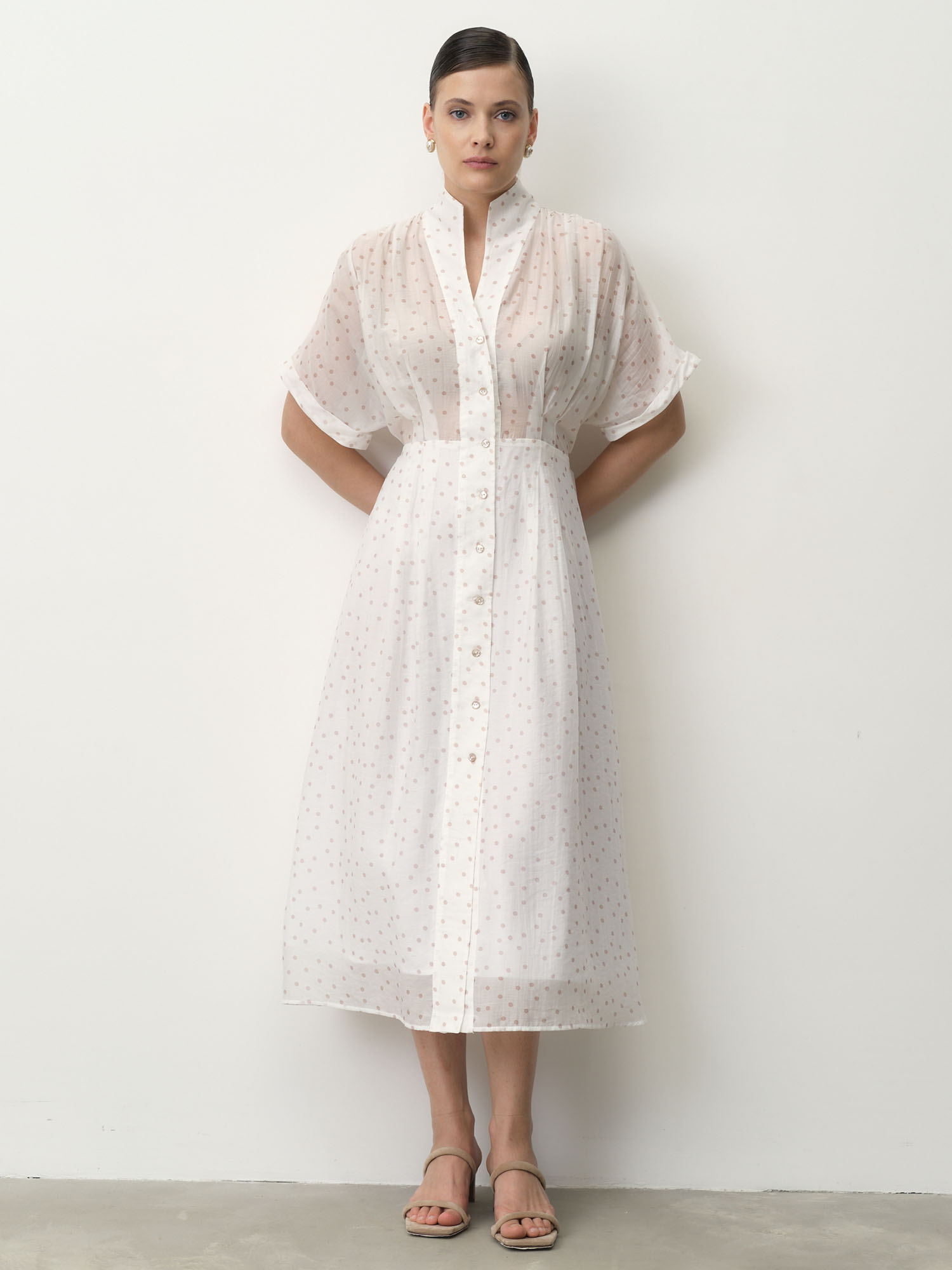 Белый в горошек — свежий и нежный оттенок с классическим принтом, придающим образу легкость и утонченность.