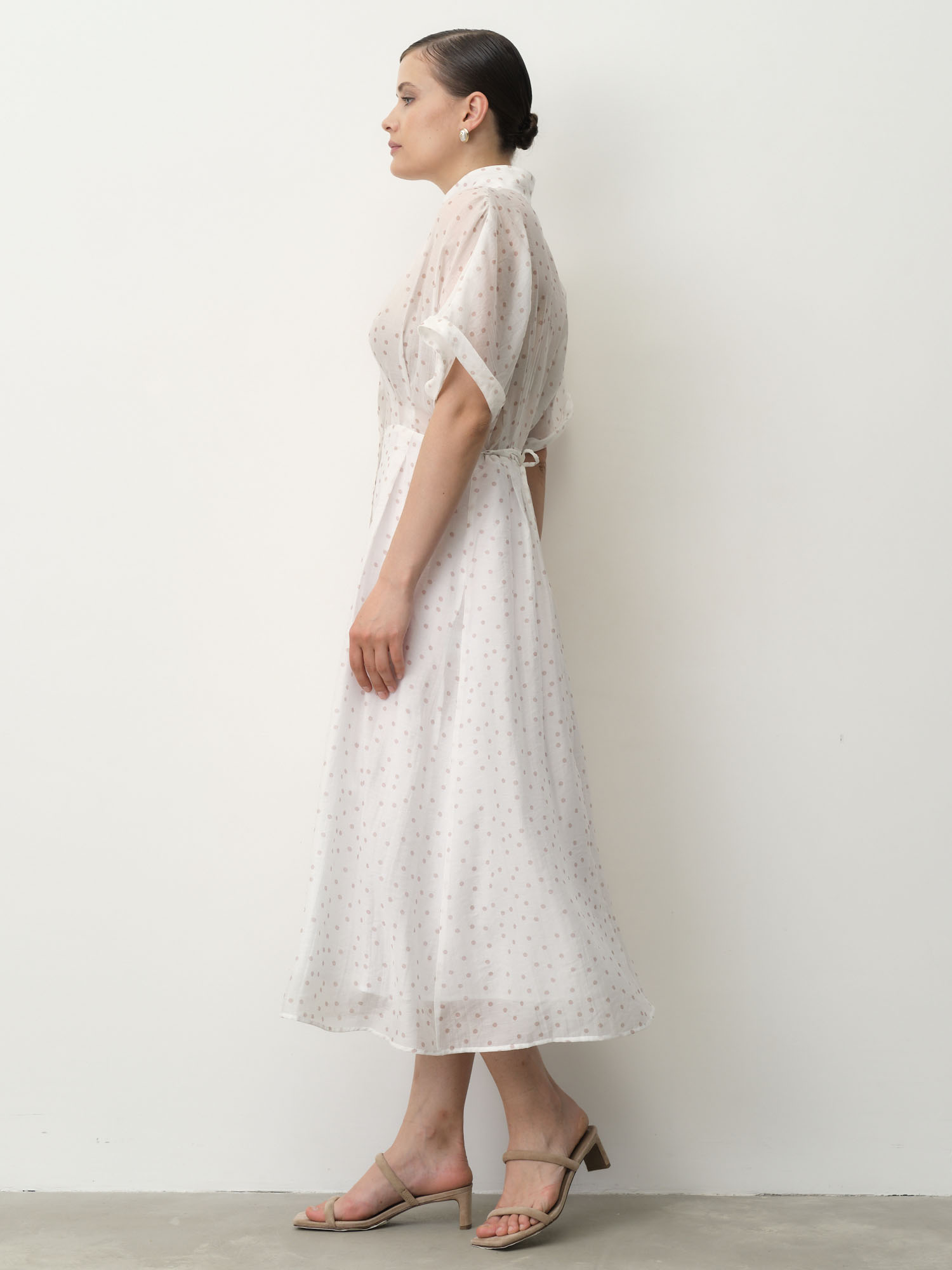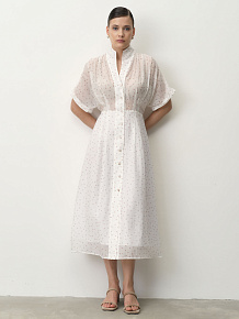 Свободный силуэт с акцентом на талии и длиной миди. Легкие рукава и струящаяся ткань создают плавный и изящный силуэт.