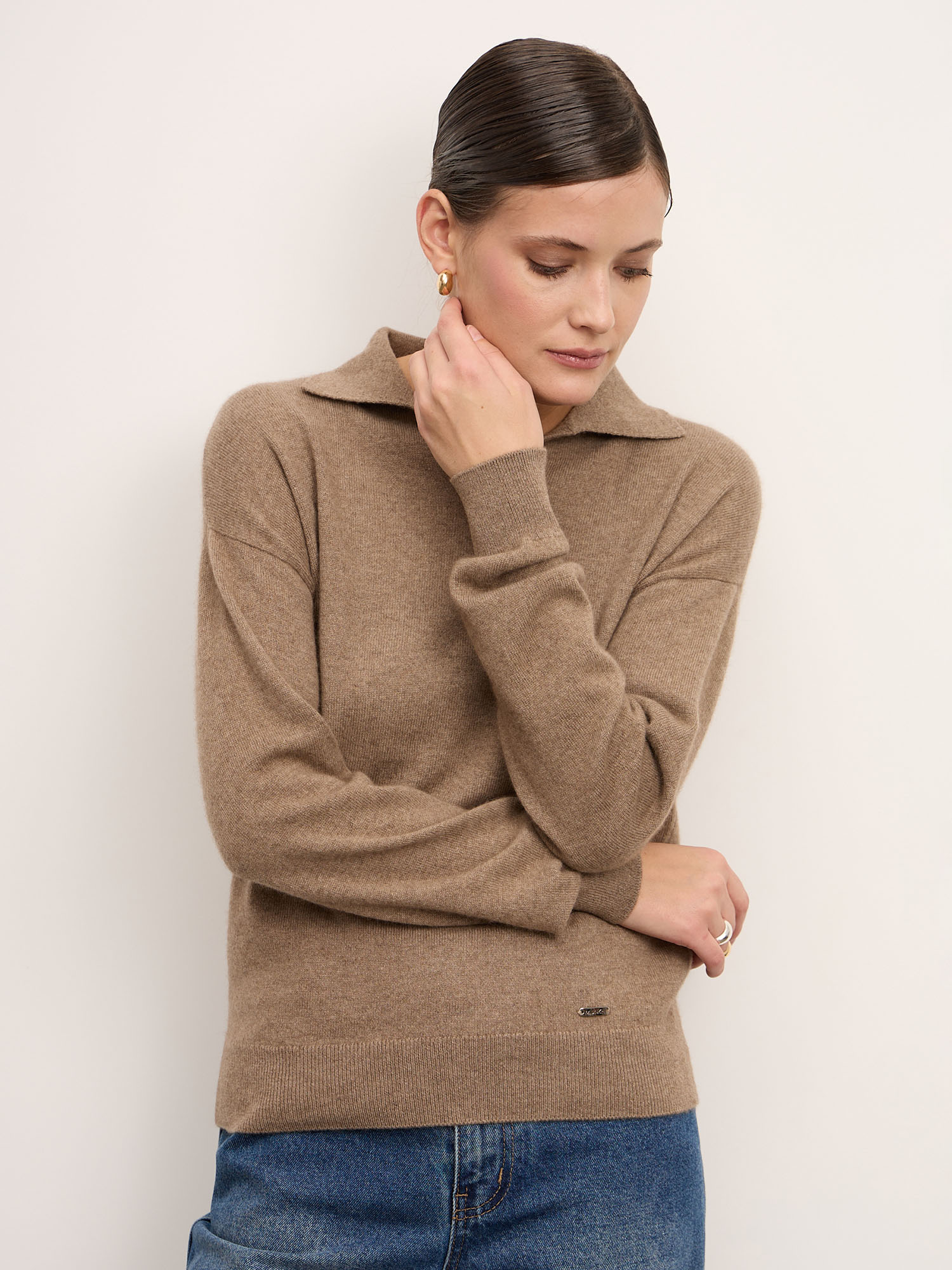 Модель выполнена с аккуратным воротником-поло и лаконичной гладкой вязкой. Свободный силуэт и мягкая линия плеч создают современный расслабленный стиль. Манжеты и низ изделия оформлены эластичной вязкой для аккуратной посадки и сохранения формы.