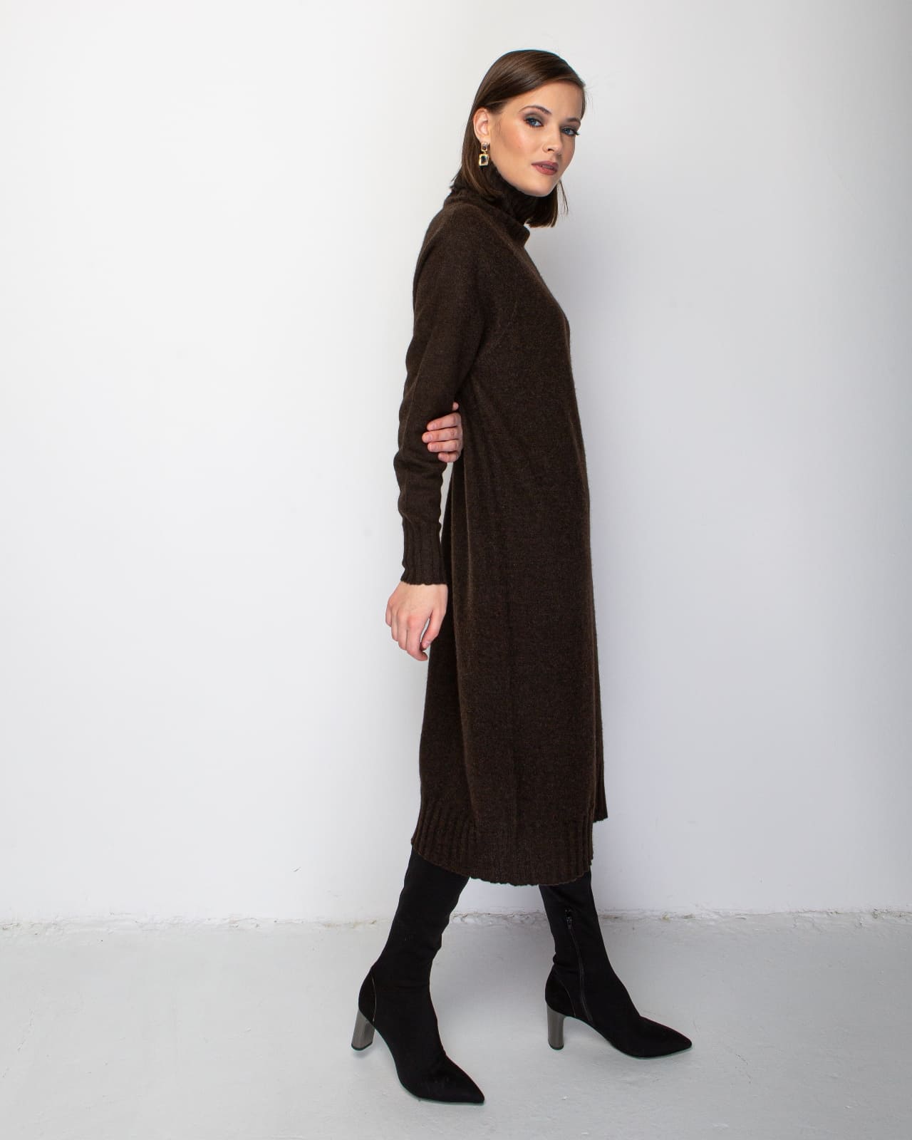 Объёмный воротник-гольф для дополнительного тепла, плотная трикотажная вязка, удлинённая длина и аккуратные манжеты. Боковые разрезы обеспечивают свободу движений и комфорт.